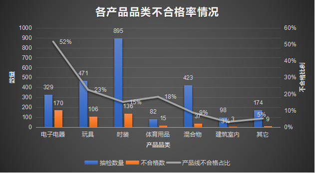 所有產品(pin)品(pin)類單獨(du)統計來看,不合規率(lv)最高的產品(pin)類別是(shi)電器(qi)產品(pin)(52%),其次(ci)是(shi)玩具(ju)(23%)和體(ti)育用品(pin)(18%)以及(ji)時裝(zhuang)(15%)。詳細情況為: