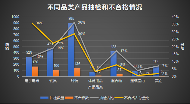 在這些抽(chou)檢的產品品類(lei)(lei)中,抽(chou)檢品類(lei)(lei)數量占(zhan)比(bi)最高的是時裝類(lei)(lei)(占(zhan)抽(chou)檢總量36%),其次為玩具(19%)和混合物(17%)以及電(dian)子電(dian)器(13%)。不合規率最高的產品(pin)類別是電(dian)子(zi)電(dian)器產品(pin)(占(zhan)所有品類(lei)的36%),其(qi)次(ci)是時(shi)裝(29%)和玩具(22%)。