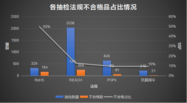 不符合最(zui)多的法(fa)規為RoHS指(zhi)令(約50%),其次是REACH法(fa)規附錄XVII(13%)、玩具指(zhi)令(10%)和POPs法(fa)規(9%)。除此之外,30%的產品未(wei)履(lv)行REACH SVHC候(hou)選清(qing)單(dan)物質的告知義務。