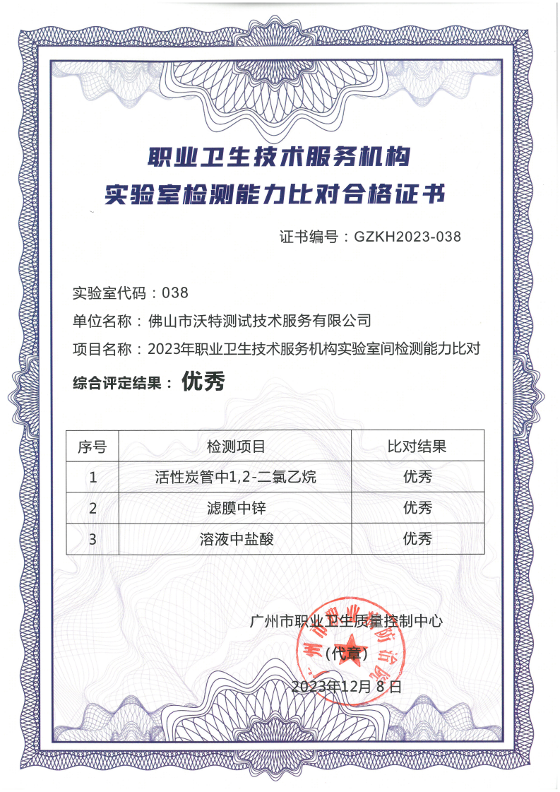 近日,沃特(te)檢驗集團佛山公司收到了廣(guang)州市職業(ye)(ye)衛生(sheng)質量控(kong)制中(zhong)心關(guan)于“2023年職業(ye)(ye)衛生(sheng)技術服務機構(gou)實驗室檢測(ce)能力比對”的(de)反(fan)饋,綜合評定(ding)結(jie)果(guo)為“優秀”。本次能力驗證包含了活(huo)性炭管中(zhong)1,2-二氯(lv)乙(yi)烷、濾膜中鋅、溶(rong)液中鹽酸(suan)的(de)檢測項目,比(bi)對結果均為(wei)“優秀(xiu)”。