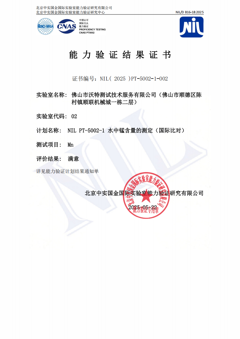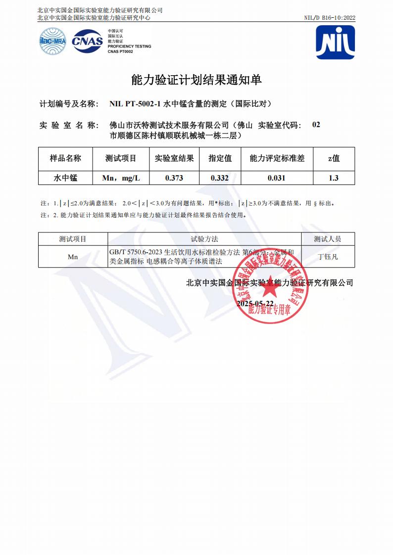 佛山沃特參加NILPT-5002-1水中錳含量的測定(國際比對)能力驗證 獲“滿意”結果