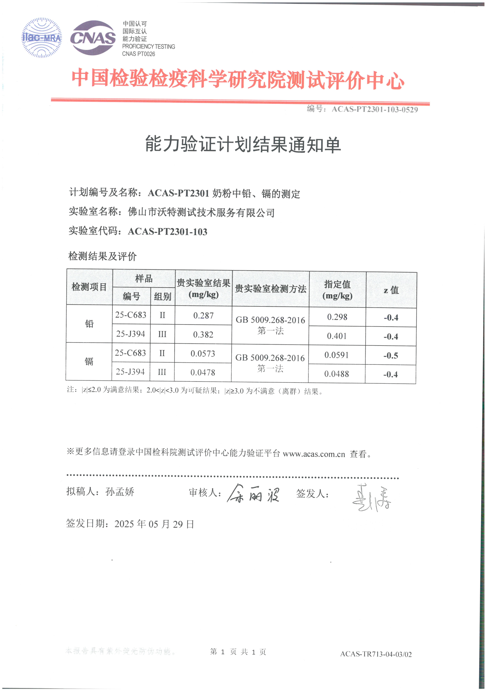 佛山沃特參加ACAS-PT2301奶粉中鉛、鎘的測定能力驗證 獲“滿意”結果