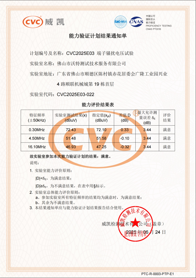 近日(ri),佛山市沃(wo)特測試技術服務有限公司參加威凱(kai)檢測技術有限公司組織的CVC2025E03端子騷擾(rao)電壓(ya)試驗(yan)能力驗(yan)證計(ji)劃,評(ping)價結果為滿意。