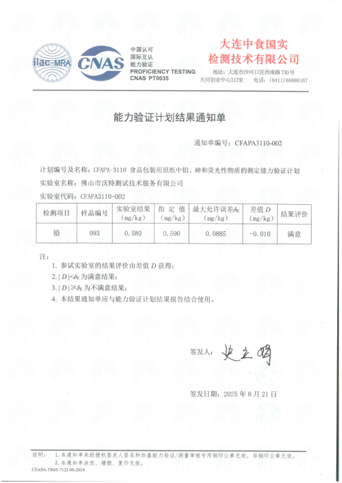 佛山沃特參加CFAPA-3110食品包裝用原紙中鉛的測定能力驗證計劃 獲“滿意”結果